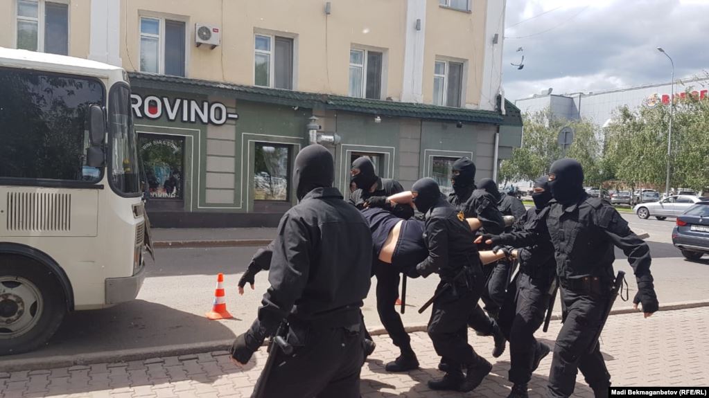 Сотрудники спецподразделения МВД несут предполагаемого участника митинга к автозаку. По подсчетам наблюдателей, за последние два года при разгоне мирных протестных акций в Казахстане было задержано свыше шести тысяч человек, в том числе правозащитники и активисты.